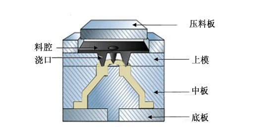 轉射模具又叫壓鑄成型模具,其結構如下圖所示,是將膠料放置在料腔中,合模后由壓料板(又名柱塞)將膠料通過注膠孔(也稱注膠道)壓入型腔中硫化生成產品,這種模具結構就是轉射模具。
